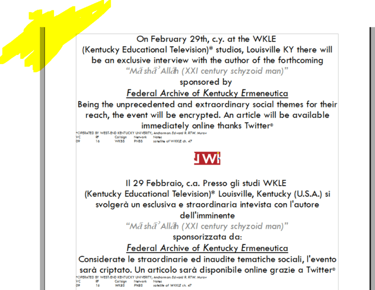 /On the sidelines of the unusual and exceptional event that took place in the United States on the occasion of the presentation of the essay “Mā shāʾ Allāh (XXI century schyzoid man)” and of which the partial and significant transcription will follow, the brief notes that the interviewee (the undersigned) and the delegation of the (virtual) intellectuals who arrived have clearly expressed how effective it is for the understanding of the interview itself or, better to specify, of the event, given the exclusivity of this abnormal rather than anomalous form. Based on a perspective commonly called “fake” (in Italian “false”) the expressive modality has certainly been altered but, in this case, the awareness of articulating the meaningful context of real and verified conditions, the lie becomes a means, tool and expedient at the same time; identifying oneself in the mystifying plot represented for this case an identification technique: an antidote capable of exhuming a reality compromised by the powers that hold it hostage, and a vital pride that rejects the paralyzed intellectual world and its unaware followers, the ignorant actors who populate virtual media. It does not matter if a certain theatricality as a waste of energy for this text is intended to be recognized, it does not matter if the fiction delivers a vulgar accent: the words that follow you will have to contrast with the same coin that was given to you as a gift. Enjoy the reading.*