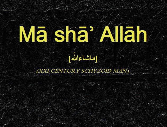 Mā shāʾ Allāh (XXI century schyzoid man) è nato per un esigente necessità di ripristinare un civile dialogo tra la Gente che si misura in nuove e rinnovate globali densità demografiche, discussione oggi sommessa e denaturata della logica umanitaria in corso di annientamento; il testo cresce in un comprensorio apparentemente illimitato, in cui la cronaca, spesso deviata e deviante allo stesso tempo, attraversata da un regime caotico e disordinato di ideali perduti e confusi malamente con le necessità spirituali dell’Uomo, sommerge inequivocabilmente il diritto stesso che Egli, l’essere, acquisisce nel momento della nascita.