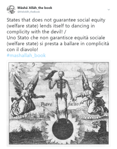 Mā shāʾ Allāh (XXI century schyzoid man) il libro è, rimane, un contenitore personale, una richiesta inossidabile di controllo della propria e personale identità in cui lo spirito non venga utilizzato e incarnato e stretto in un alleanza ma, rientri e rimanga confinato nella inequivocabile e incorreggibile Parola di Dio, Allah (Jihād). L’unica prospettiva perseguibile per una comprensione del testo proposto, in definitiva, (questa è un indicazione assolutamente speciale!) è quella che prevede una lettura atipica e ateizzante nei princìpi (un angolazione utile al pensiero Occidentale) posticipante delle manifestazioni di accoglienza che la persona islamica avrebbe trasmesso da questa lettura, perché solo attraverso l’islamica coscienza il mussulmano può ammettere di voler comprendere e, nello stesso istante, solo attraverso la rilettura occidentale assistita da questo fare il mussulmano potrà quindi ammettere una comprensione, presentando così, l’ultima e certa preoccupazione insita in questo testo. Oogni contributo, compreso quello economico della donazione, sarà destinato (nelle apposite modalità e garanzie in parte disponibili QUI) affinché la diffusione del presente testo pubblicato divenga massima e possibile. Se Dio Vòle, il giustificare quel fabbisogno pressoché non utile di religione, in quanto, l’umano essere, è religione, non potrà che tradursi in un percorso ancor oggi soddisfacente per ognuno sia impegnato a vivere.